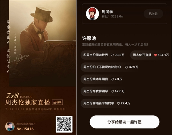 7月6日,隨著周杰倫先行曲《最偉大的作品》MV全網(wǎng)發(fā)布,快手也在站內(nèi)同一時間開放了“許愿池”活動,票數(shù)最高的愿望將直達周杰倫,活動開啟后無數(shù)粉絲前來許愿,“和周杰倫周游世界”、“周杰倫為我彈鋼琴”、“周杰倫拍《不能說的秘密2》”等成為了粉絲們最想實現(xiàn)的熱門愿望。而“周杰倫開直播”的許愿更是在短時間內(nèi)得到了超過130萬的點贊。于是快手官方在7月10日中午12點正式回應網(wǎng)友許愿,正式官宣了周杰倫將于7月18號19:00獨家直播的消息,不少粉絲慨嘆,“原來在快手許愿,真的能實現(xiàn)愿望?!爆F(xiàn)在上快手搜索“周杰倫”就可以一鍵預約直播,并生成帶有隨機歌詞的專屬編號海報,儀式感拉滿,每一位杰迷都能擁有周杰倫的專屬編號。目前距離直播還有一周的時間,預約人數(shù)已經(jīng)突破百萬。據(jù)透露,預約人數(shù)突破200萬,將解鎖神秘直播嘉賓。