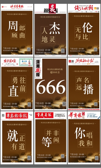 周杰倫的快手直播預約人數從666萬到888萬,僅僅用了一天的時間,周杰倫本人的快手賬號@周同學,粉絲數也已超4000萬。在預約人數超666萬后,更有北京青年報、新聞晨報、半島都市報等九大報紙用“成語的方式打開周杰倫”,為其直播應援打call。“「周」郎顧曲”、“人「杰」地靈”、“無與「倫」比”、“勇往「直」前”、“聲名遠「播」”、“「就」正有道”、“并非「等」閑”、“「你」唱我和”,幾個醒目的大字連在一起就是“周杰倫直播就等你”和“周杰倫直播預約數超666萬”。當四字成語的文化底蘊與周杰倫《最偉大的作品》碰撞在一起,呈現出流行文化和傳統文化的跨界魅力。不愧是華語樂壇流量天花板,這個排面也太足了!
