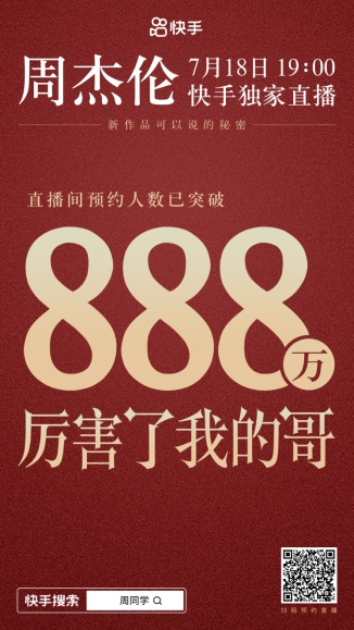 隨著“杰倫熱”的持續升溫,周杰倫7月18日晚7點在快手的“新作品可以說的秘密”獨家直播預約也迎來了井噴式增長。據悉,新專輯發布后的短短24小時內,這場直播的預約人數暴增500多萬,而在7月16日晚23點許,上升至888萬,這一數字一舉打破了快手此前單人直播預約人數的歷史紀錄,且這一數字還在持續增長中。面對不斷被刷新的紀錄,快手已與吉尼斯世界紀錄的組織方取得聯系,希望借此來記錄這星粉共同創造的不凡時刻。
