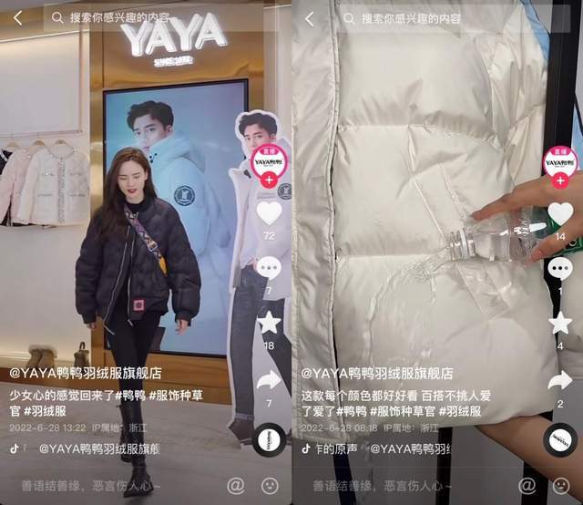 例如,當主播在介紹一款鴨鴨女士輕薄羽絨服,會強調這款羽絨服精選90鴨絨,同時還詳細介紹了這款羽絨服所使用的分割充絨技術,有效防止鉆絨。同時,鴨鴨在直播或者短視頻中還會“現身說法”,通過直接往衣服上倒水等方式證明羽絨服的品質。