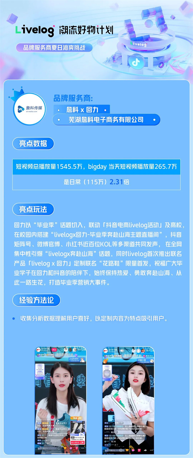 品牌服務(wù)商「蕪湖詹科電子商務(wù)有限公司」則為品牌「回力」打造出“l(fā)ivelog × 奔赴山海”主題活動(dòng),發(fā)布聯(lián)名鞋款「livelog 花路鞋」,精準(zhǔn)匹配每一位“社會(huì)新鮮人”的需求,用定制化的新品發(fā)售成功引爆關(guān)注,短視頻總播放量突破1500萬(wàn),bigday當(dāng)天短視頻播放量突破260萬(wàn),是日常的2.3倍。