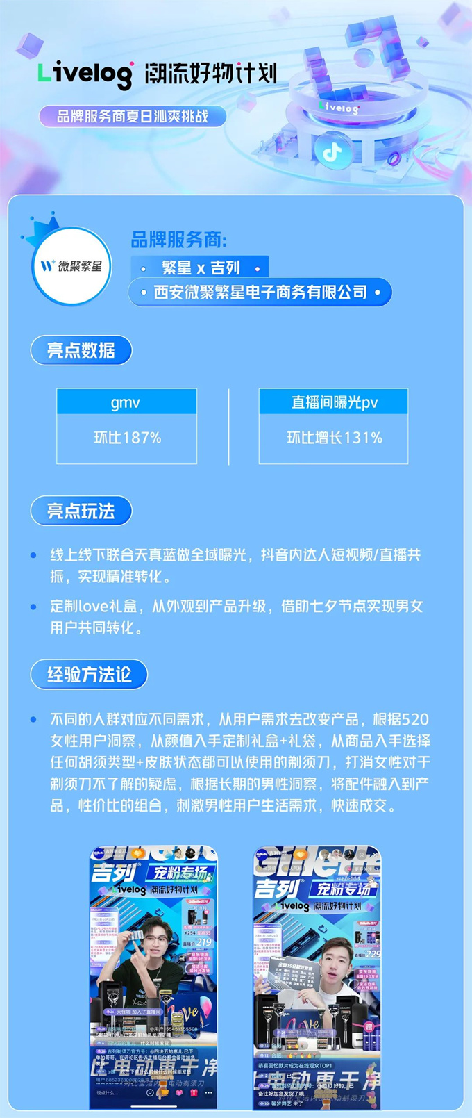 品牌服務(wù)商「西安微聚繁星電子商務(wù)有限公司」與「吉列」聚焦七夕節(jié)日關(guān)鍵詞,打造七夕主題直播間。選品上以任何胡須類(lèi)型+皮膚狀態(tài)都可以使用的剃須刀及附帶配件的性價(jià)比組合促進(jìn)人群破圈;包裝上從顏值入手,打造定制love禮盒營(yíng)造節(jié)日氛圍。此外,活動(dòng)期間針對(duì)不同人群需求發(fā)布大量針對(duì)性短視頻引流,快速覆蓋精準(zhǔn)人群,最終實(shí)現(xiàn)直播間曝光環(huán)比增長(zhǎng)131%,GMV環(huán)比增長(zhǎng)187%。