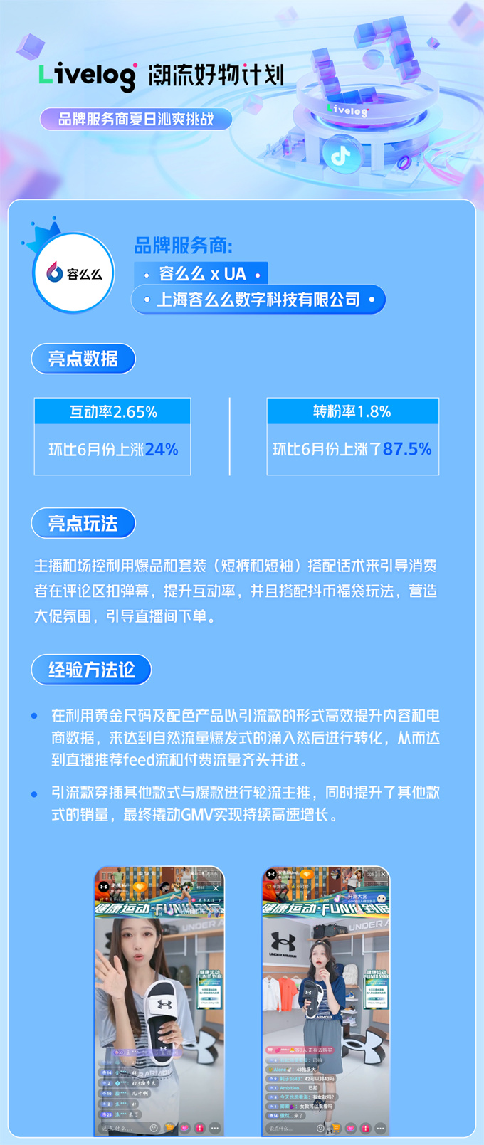 以上亮眼的轉(zhuǎn)化成績(jī),均來(lái)自于抖音電商服務(wù)商團(tuán)隊(duì)于7月16日-24日發(fā)起的「livelog潮流好物計(jì)劃-夏日沁爽挑戰(zhàn)活動(dòng)」。此次活動(dòng)為何能引爆如此多直播間GMV集體增長(zhǎng)?有哪些方法論可供后續(xù)借鑒、沿用?下面讓我們重新回到活動(dòng)現(xiàn)場(chǎng),從表現(xiàn)優(yōu)異的品牌服務(wù)商與品牌中,一同尋找潮流好物營(yíng)銷(xiāo)的“作戰(zhàn)方法論”。