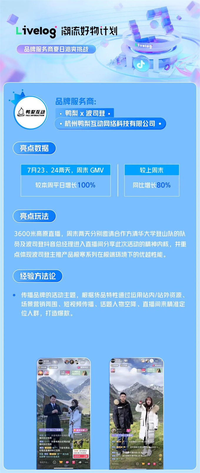其中,品牌服務(wù)商「杭州鴨梨互動(dòng)網(wǎng)絡(luò)科技有限公司」攜手「波司登」,開(kāi)啟一場(chǎng)3600米的名副其實(shí)的“高原直播”,打造出高原背景下頗具美感的戶外直播場(chǎng)。作為國(guó)貨之光的波司登品牌與清華大學(xué)登山隊(duì)合作,還實(shí)現(xiàn)了精神導(dǎo)向的“乘法效應(yīng)”,強(qiáng)化了自強(qiáng)不息,永爭(zhēng)第一的中國(guó)式精神。這激起了用戶層面廣泛的情感共鳴,僅7月23、24兩天,直播間GMV較平日增長(zhǎng)100%,較上周末增長(zhǎng)80%。