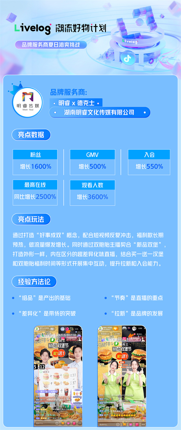 在livelog潮流好物計劃·夏日沁爽挑戰中,品牌服務商湖南明睿文化傳媒有限公司就為快餐品牌德克士取得了亮眼的成績:數據顯示,活動期間該品牌直播間最高在線人數同比增長2500%,觀看人數增長3600%,粉絲量增長1600%,入會人數增長550%,GMV增長500%。