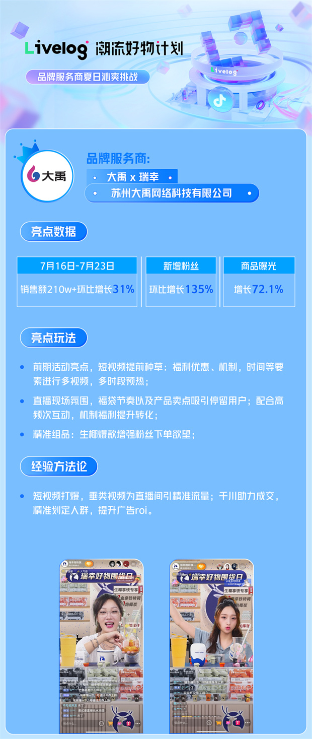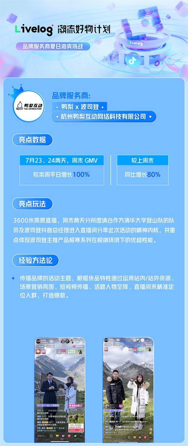 在抖音電商服務商團隊發起的livelog潮流好物計劃·夏日沁爽挑戰中,通過這些高增量品牌商家背后的抖音電商服務商視角可以發現,無論日常還是節點,品牌資產增長規律與方法論都有章可循。