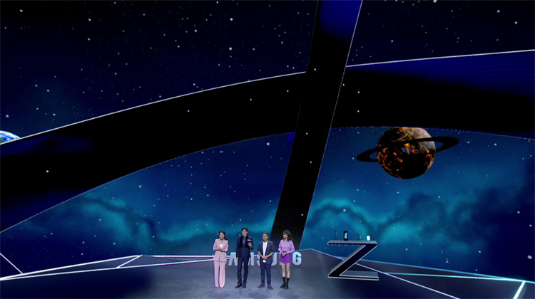 本場直播形式,創新采用了虛擬技術,在線打造了一場虛實相生的沉浸式感官盛宴,據悉,這是三星手機首次運用虛擬舞臺設計、MR虛擬混合現實等技術定制構建絢麗的3D虛擬互動場景,并基于UE引擎,實現了虛擬場景和現實人物的合成直播。
