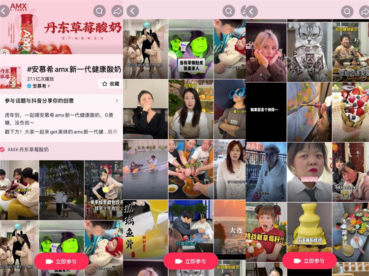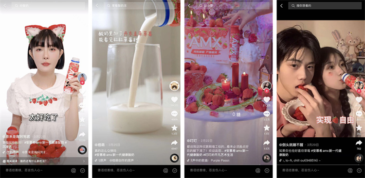 如何讓季節(jié)性爆款產(chǎn)品成為“長紅”產(chǎn)品?巨量云圖捕捉到特殊時期大眾宅家的生活場景,將安慕希AMX丹東草莓酸奶產(chǎn)品從“功能性”拔高為更深層的“情感陪伴”,結(jié)合“全dou快來吃”IP,打造了全民共創(chuàng)的內(nèi)容玩法,在提升用戶參與熱情的過程中也提升了該產(chǎn)品在用戶內(nèi)心的陪伴價值,幫助品牌不斷累積優(yōu)質(zhì)內(nèi)容。