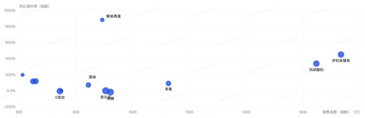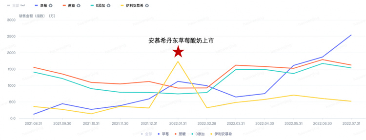 通過巨量云圖商品洞察發(fā)現(xiàn),安慕希丹東草莓酸奶在上市月的銷售情況表現(xiàn)迅猛,隨后在為期半年的時間里,成功激發(fā)了草莓口味、無蔗糖和0添加特征的酸奶產(chǎn)品持續(xù)的銷售增長。品牌投放期間,草莓口味酸奶的銷售額在行業(yè)中一直保持著領(lǐng)先位置,長周期的爆品關(guān)注度得以體現(xiàn)。