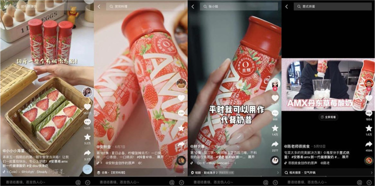 好的達人內(nèi)容是新品走進用戶內(nèi)心的介質(zhì)。在達人內(nèi)容策略上,伊利運用巨量云圖洞察品牌人群偏好,以個性化、多圈層內(nèi)容創(chuàng)意豐富品牌內(nèi)涵。比如配合平臺生活美食相關(guān)的IP,形成內(nèi)容破圈,提升品牌主張,幫助安慕希AMX丹東草莓酸奶新品積累用戶談資。