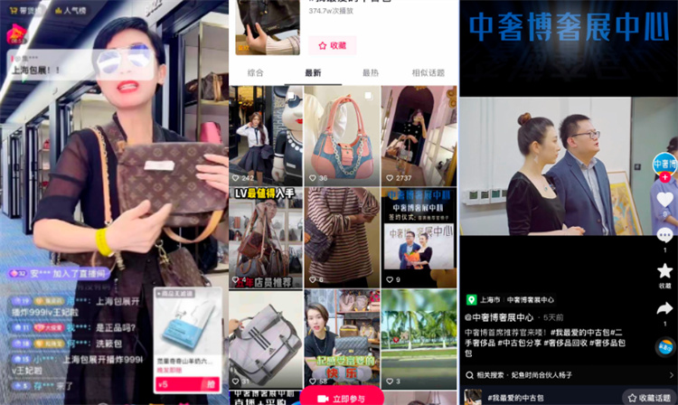 ● 短視頻方面,參展商家紛紛發(fā)布#我最愛的中古包 系列短視頻,圍繞二奢好物展開創(chuàng)意創(chuàng)作。種草指南、探店、開箱……短視頻話題將小眾的中古話題傳播開來,為直播預熱充分預熱、蓄力。