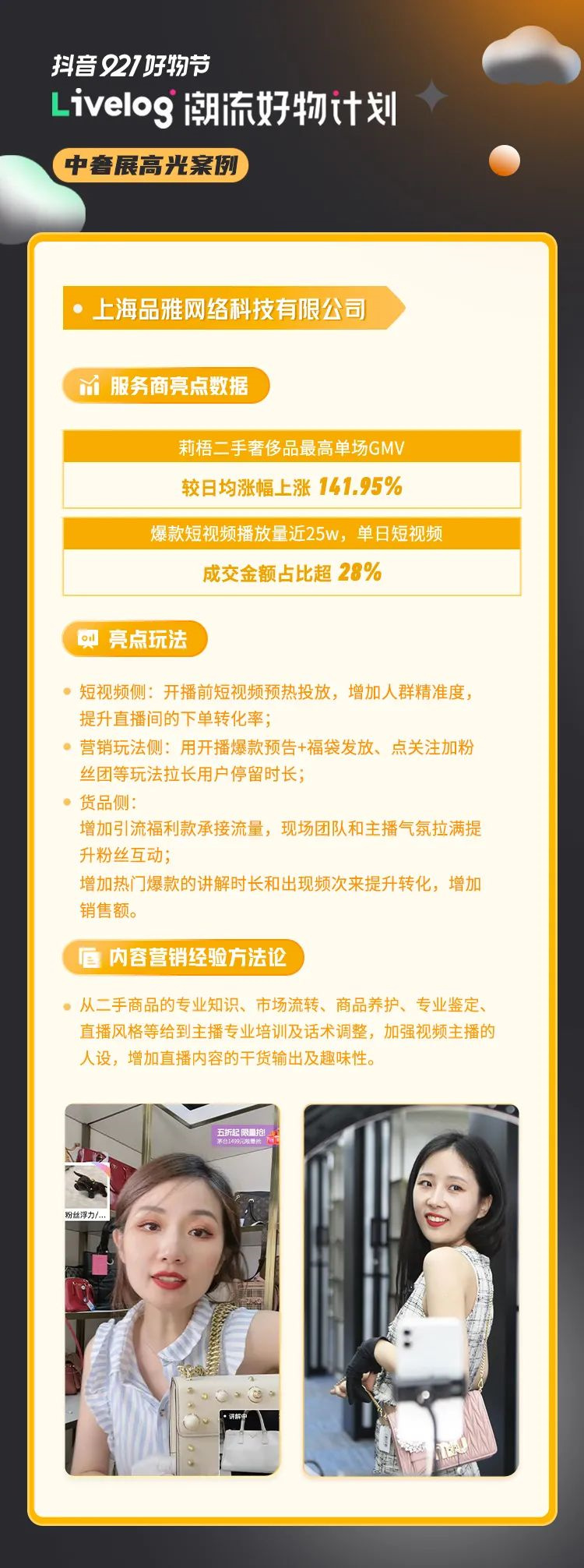 在內(nèi)容方面,“如何吸引更多的興趣流量”是關鍵。抖音電商服務商為二手奢侈品行業(yè)潛力商家提供了平臺專屬流量扶持政策,并為奢展中心直播商家提供了10間設計直播間等設施支持,全面解決困擾中小商家的“流量之痛”與“場景之痛”。此外,抖音電商服務商「最愛的中古包」livelog主題活動還借助「抖音921好物節(jié)」大促節(jié)點,借助短視頻、直播、泛商城等渠道大促,助力二手奢侈品迎來第三季度交易高峰。