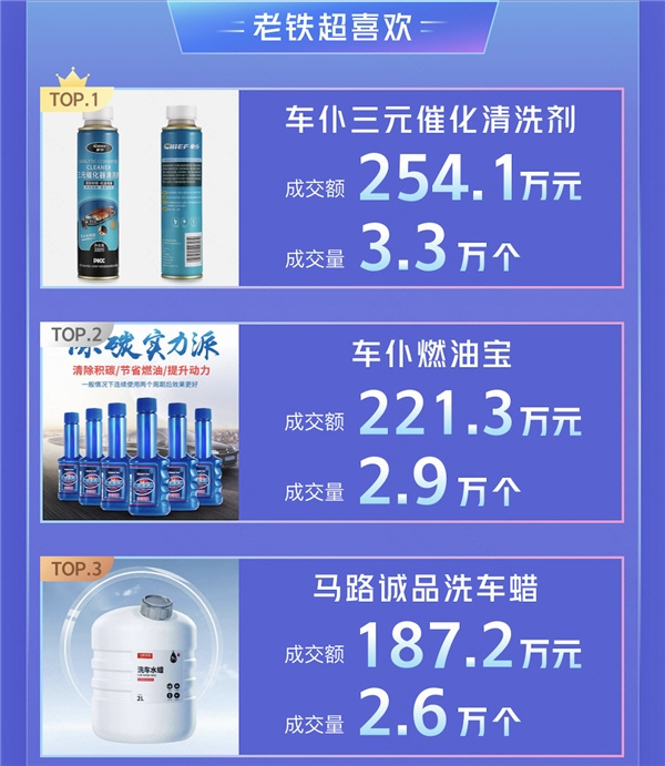 在甄選優(yōu)質(zhì)創(chuàng)作者、多元玩法創(chuàng)新、官方扶持等多種舉措下,“快說(shuō)車甄選·99車品節(jié)”效果顯著。從整體數(shù)據(jù)來(lái)看,截至目前,#快說(shuō)車甄選# 話題下累計(jì)7578個(gè)作品,共獲得1.6億+曝光,#99車品節(jié)# 話題下2069個(gè)作品曝光量達(dá)5900萬(wàn)+;“99車品節(jié)”相關(guān)內(nèi)容曝光更是破億,總成交額同比增長(zhǎng)94.7%,總訂單量同比增長(zhǎng)103.6%,買家分布基本覆蓋所有區(qū)縣;從互動(dòng)效果來(lái)看,開播場(chǎng)次同比增長(zhǎng)23.1%,觀看次數(shù)同比增長(zhǎng)62.7%;從商家增量來(lái)看,賣家數(shù)量同比增長(zhǎng)31.5%,成交額同比增長(zhǎng)100%的賣家數(shù)近4000,成交額破百萬(wàn)商家同比增長(zhǎng)65.0%,成交額破百萬(wàn)單品同比增長(zhǎng)28.6%;從最終成交商品來(lái)看,最受用戶喜歡的養(yǎng)護(hù)維修單品是車仆三元催化清洗劑,成交量超3.3萬(wàn)個(gè),成交額達(dá)254萬(wàn)元;其次為車仆燃油寶,成交量2.9萬(wàn)個(gè),成交額220余萬(wàn)元;緊隨其后的是馬路誠(chéng)品洗車蠟,成交量超2.6萬(wàn)個(gè),成交額達(dá)187萬(wàn)元。
