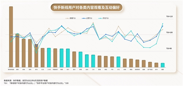 作為短視頻賽道的典型應用、在新線人群中有著高滲透率且新線用戶規(guī)模保持高增長的快手,成為品牌加速滲透并深度挖掘新線市場的重要渠道。而快手新線用戶所展現(xiàn)出的強粘性和高潛力兩大優(yōu)勢也為品牌增長提供更多驅(qū)動力。在內(nèi)容消費上,快手新線用戶更享受在平臺社交,其互關率、點贊量增速、評論量增速、分享量增速明顯高于高線用戶,他們偏愛三農(nóng)、家庭時光、才藝、攝影等內(nèi)容。