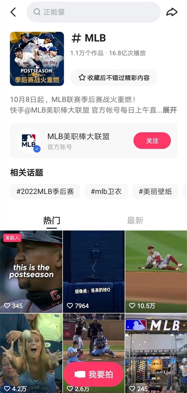 在棒球運動方面,MLB官方在2020初便入駐快手,通過賬號@MLB美職棒大聯盟 持續發布賽事相關內容、進行棒球運動科普,并基于#MLB、#第一堂棒球課等多個線上話題與快手用戶展開互動,讓更多泛體育領域的人群能夠參與進來,感受棒球運動的魅力。目前,快手平臺上#MLB 話題相關短視頻播放量已超過16.7億次,此次和MLB的合作,也是快手持續發力國際化體育內容布局的又一重要動作。