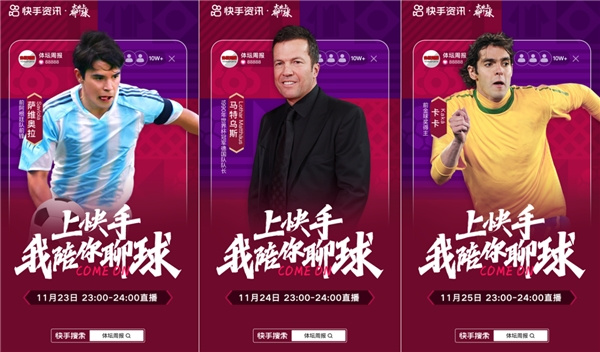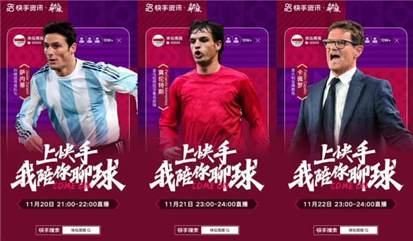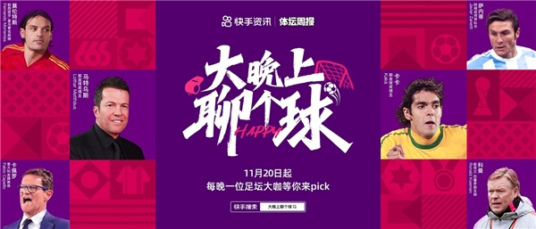 據悉,隨著世界杯賽事的持續舉行,《大晚上聊個球》將共計在23天的比賽日每晚邀請一位知名球星和教練,為快手用戶提供更多維的世界杯觀點。11月22日至25日晚,意大利金牌教練卡佩羅、“南美足球先生”薩維奧拉、前金球獎得主馬特烏斯、前金球獎得主卡卡就將分別來到節目直播間,與中國球迷分享賽場內外的精彩。