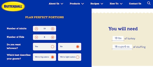 為了幫助消費者解決如何準備一只完美火雞的難題,火雞品牌Butterball在其網站上推出了一個在線計算器,用戶只需輸入用餐人數,并選擇其他用餐細節,計算器就可以自動計算出火雞、各種調料和餡料所需的克重。