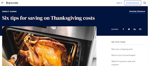 此時,品牌若站在消費者的角度提供一些貼心的購物提示或幫助信息,將有助于緩解消費者的焦慮情緒和消費壓力。例如,個人理財網站Bankrate.com發布了一條博客,博客中列舉了幾條如何在感恩節期間節省開支的小貼士。文中還附上了一些實用的網站,消費者可以訪問相應的網站獲取優惠券或購物技巧,還可以提前了解消費趨勢以做好感恩節購物規劃。