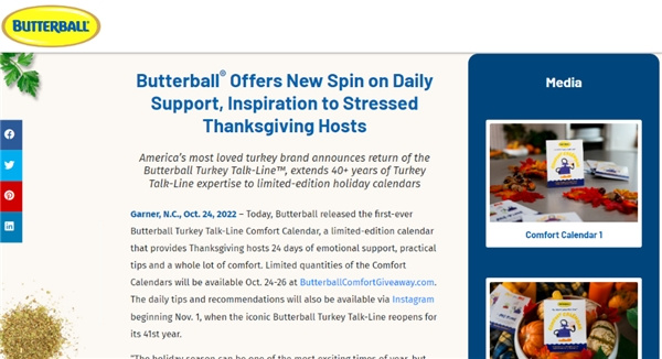 此外,Butterball還設置了“火雞熱線”,專門為消費者解答一切關于如何烹制火雞的相關問題。