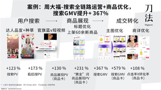 以周大福為例,通過優化主圖信息,增加活動促銷信息和品牌信息,選用帶有場景信息的產品上身圖和細節屬性圖,周大福的搜索 GMV 同比提升了 367%。