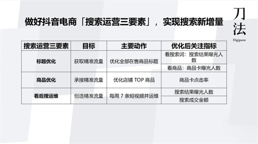 基于此,抖音電商正在和商家一起探索“搜索+”的內容邊界,推出涵蓋標題優化、商品優化和看后搜運維三要素的搜索運營方法。