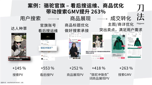 借助看后搜運維帶動交易額增長的品牌還有駱駝官方旗艦店,通過前期發布 40+ 帶有#駱駝沖鋒衣 話題詞的達人種草視頻,在官旗賬號的短視頻評論中進行看后搜運維,分別帶動搜索 PV 增加 145%,看后搜 PV 增加 553%。