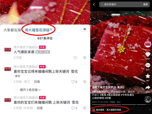 周大福通過看后搜運維,牢牢綁定用戶,實現了交易全鏈路,避免被分流到其他店鋪,具體來說,就是在視頻下方相關搜索、評論區的吸頂詞和小藍字超鏈接,主動引導用戶點擊。