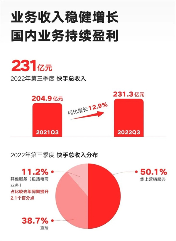 財報顯示,第三季度,快手總營收達(dá)231.3億元,國內(nèi)經(jīng)營利潤超3.75億元,連續(xù)兩季度實現(xiàn)單季盈利。快手的日活、月活用戶規(guī)模持續(xù)增長,并突破歷史新高。廣告、直播、電商三大核心業(yè)務(wù)都出現(xiàn)了增長,其中,快手直播業(yè)務(wù)收入為89億元,同比增長15.8%。