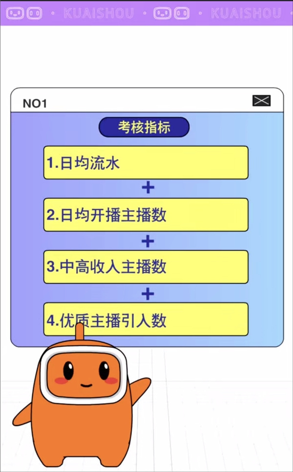 針對外站想?yún)⒓踊顒拥墓珪?快手直播不僅預(yù)留了一周時間來給公會來完成入駐流程,還配置了專屬運營,給符合資質(zhì)的公會準(zhǔn)備了一個綠色通道。同時,在活動的任務(wù)考核上,給新公會設(shè)置了單獨的內(nèi)容,給足了新公會發(fā)展機(jī)遇與成長空間。