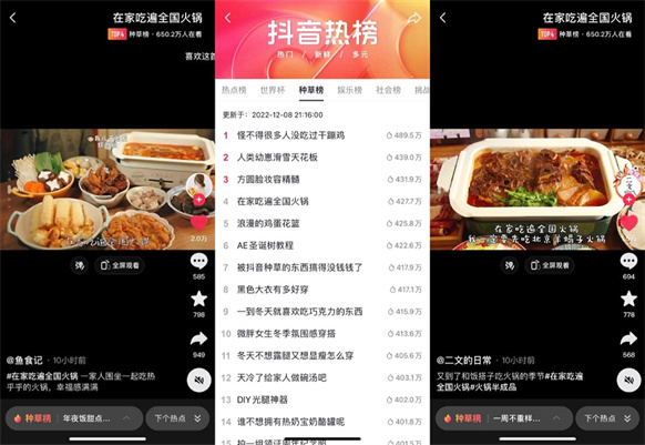恰逢火鍋旺季“沸騰期”,為了更好地激發火鍋愛好者們的關注與參與,抖音在站內打造活動話題#在家吃遍全國火鍋 ,數百位科普、美食、劇情、測評等不同類型的達人積極參與其中,圍繞此話題進行短視頻內容創作,通過沉浸式內容體驗打造極具火鍋氛圍的站內營銷場景,助力12月8日當天,#在家吃遍全國火鍋 話題播放量破億,榮登種草榜第4位。在營造站內火鍋季氛圍的同時,也為用戶提供了更多關于全國各地火鍋的吃法、攻略或特色火鍋介紹、知識分享,營造出滿滿的吃火鍋氛圍,讓用戶體驗感十足。