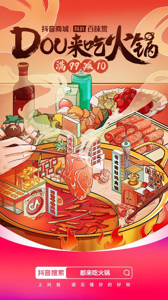 新人群、新需求、新市場的變化加劇,讓抖音電商洞察到消費者需求和行業趨勢的變化,于是聯合諸多火鍋調料、食材商家,搶先輸出“火鍋自由”的概念,盤點食品、生鮮、酒水等符合火鍋聚餐消費場景的品類,在站內打造“抖in百味賞·DOU來吃火鍋”活動。活動通過“找準人群,進行場景化種草提升消費者興趣和需求”和“聯合商家推廣產品,滲透核心消費者”來打通“貨找人”與 “人找貨”雙向消費鏈路,運用商城發力、盤品盤商、邀請達人參與短視頻創作、滿減優惠券等手段,將諸多在家便能方便享用美食的商品和相關福利輸送給消費者——不僅為食品行業開啟了一場火鍋“盛宴”,為消費者打造集搜、逛、買一體的購物體驗,助力商家引爆季節銷售,也同時強化了興趣客群對“上抖音商城,能夠實現火鍋自由”的認知。