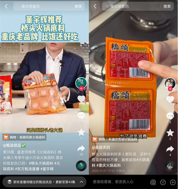 以橋頭火鍋底料為例,品牌在活動上線前、中、后期,鋪設中腰部達人、合作頭部主播以多樣的內容形式花式種草產品,讓消費者直接看到產品賣點,聚合達人及主播的私域流量,推動活動內容出圈,成功讓其產品被更多消費者所看到,利用活動激發潛在興趣消費者的購買欲望,明星、達人視頻評論區、直播間提供跳轉鏈接入口,用戶可一鍵直達完成購買,助力橋頭火鍋底料活動期間實現生意增量爆發。