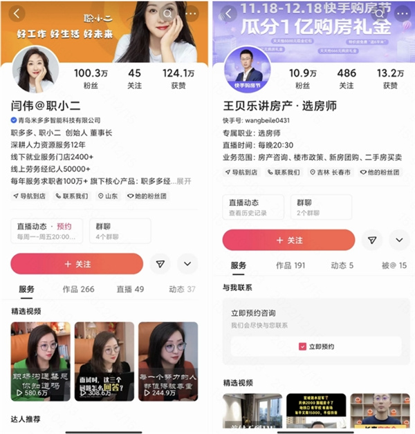 基于自己獨特的生態構成,快手直播生態的產業化融合發展位于行業前列,已經形成了成熟的“直播+”業務模式。有人面臨找工作的難題,會來到@閆偉@職小二 的直播間尋找機會;有人存在購房需求,會進入@王貝樂講房產·選房師 的直播間,咨詢政策與樓盤優劣勢……用戶多元細分的直播內容需求日益加強,這也意味著,主播需要進行內容升級進一步滿足用戶。