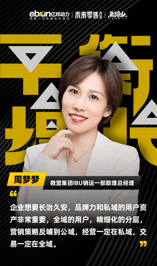 【億邦原創】12月15日消息,在平衡增長·2023億邦未來零售大會上,微盟集團智慧商業事業群IBU銷運一部助理總經理周夢夢發表了題為《零售企業數智升級,全域經營驅動價值增長》的演講。她指出,目前企業正在面對公域私域的選擇和平衡,面對這樣的選擇與平衡,企業應“私域經營、全域交易”,并長期堅持構建全域增長的模型。