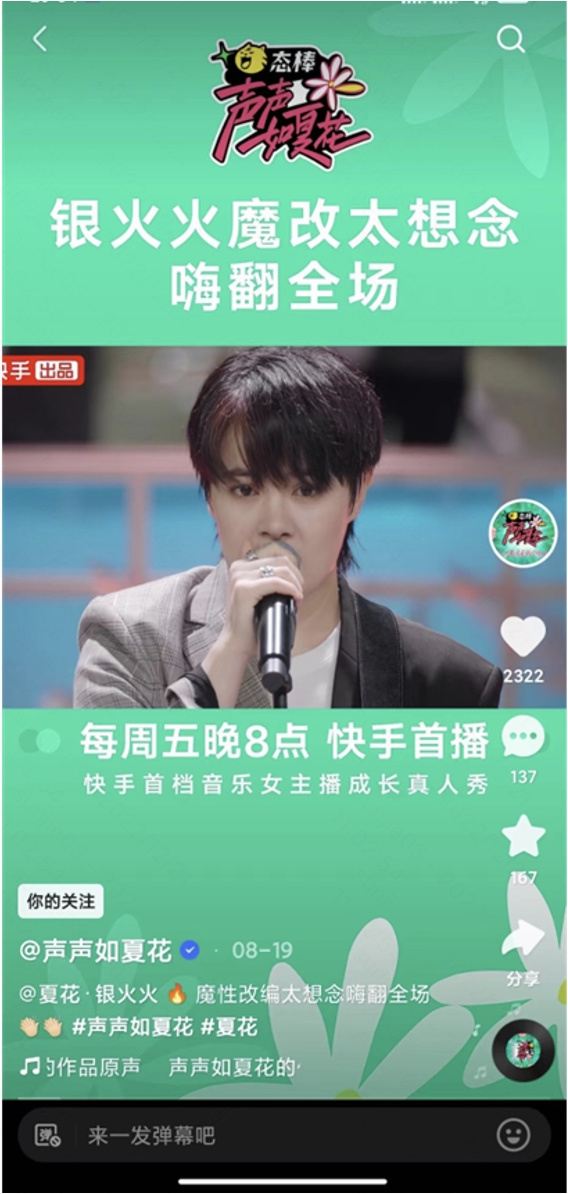 專業(yè)歌手銀火火,是娛加娛樂在2021年底簽約的主播。根據(jù)她的才藝素養(yǎng),娛加娛樂當即讓她參加了2021快手直播年度盛典,并不斷給她投流增加曝光,助其零粉起步拿到公會賽女主播亞軍。2022年快手制作音樂女主播成長真人秀《聲聲如夏花》,娛加娛樂又推薦她參與錄制,最終成功進入成團名單,在快手的粉絲量也突破118萬,收獲了一批有黏性、有消費力的“媽媽粉”。