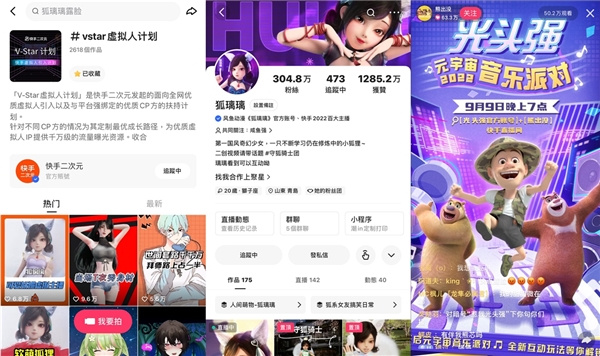 其次,在平臺政策方面,快手二次元更是為虛擬直播和虛擬主播養成提供大力扶持,推出“V-Star”等虛擬人扶持計劃,面向全網引入優質虛擬人,針對不同虛擬人賬號情況定制成長路徑,為虛擬人提供冷啟及加速成長保障,目前快手粉絲量超300萬的“狐璃璃”就是在“V-Star”計劃激勵下從0到1快速成長的頭部案例。