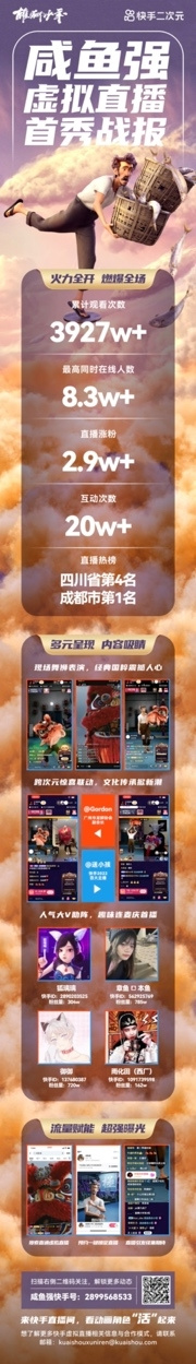 在直播中,咸魚強化身虛擬主播隆重出道,不僅展示了舞獅等才藝,與直播間粉絲親密互動,還與快手達人主播連麥形成跨次元聯動。最終,2小時的直播收獲互動次數超20萬,累計觀看次數超3900萬,最高同時在線8.3萬人,再度點燃“雄獅少年”熱度。