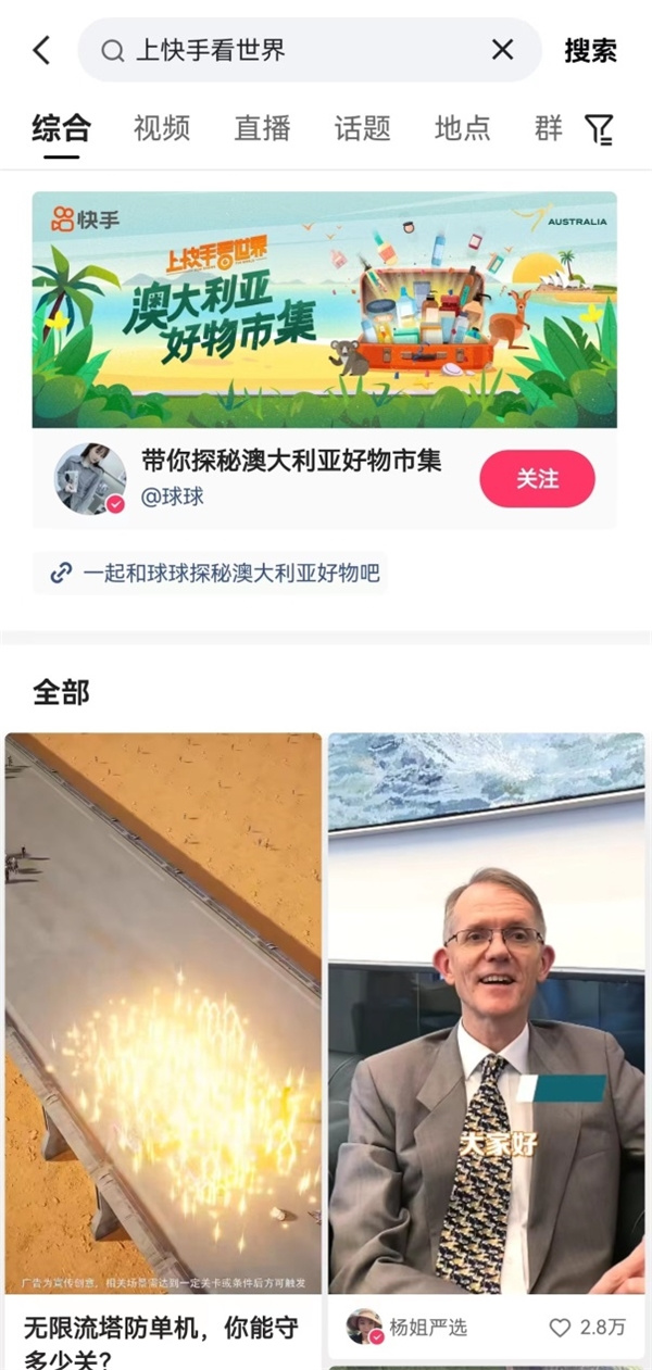 針對“2022上快手看世界·澳大利亞好物市集”,快手方面打造了專屬活動頁,并配置了搜索Banner等資源位,一站式整合活動相關直播、短視頻等內容,其中便包括“澳貿委Austrade”賬號發布的澳洲好物推介視頻。