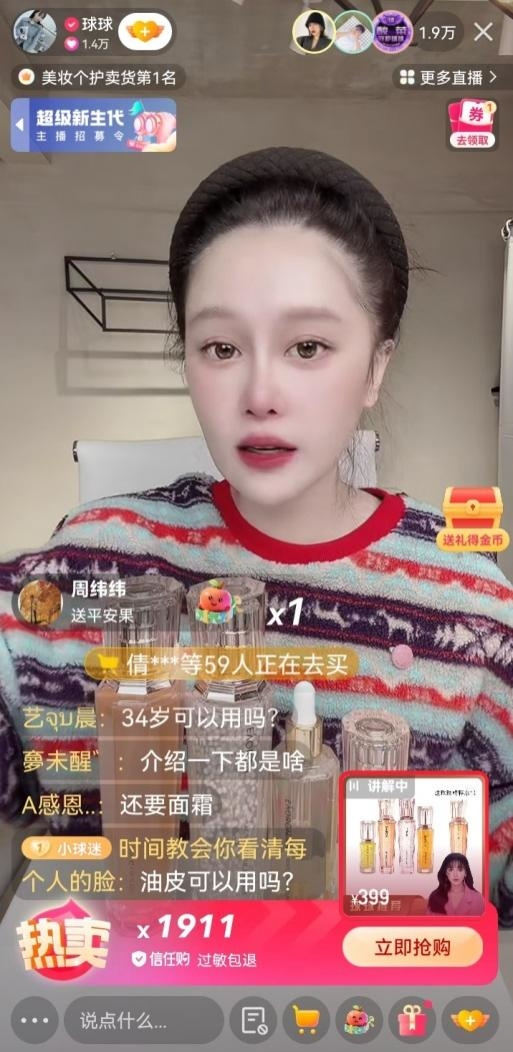 直播中,球球不僅詳細介紹了每款產品的特色成分與功能,還多次在無美顏濾鏡的情況下使用水乳、面膜、眼霜、眼膜等產品,展示產品的真實使用效果,為用戶提供直觀的購物參考。這一方式也受到了直播間用戶的喜愛和好評,多款商品在直播間上架便瞬間售罄。