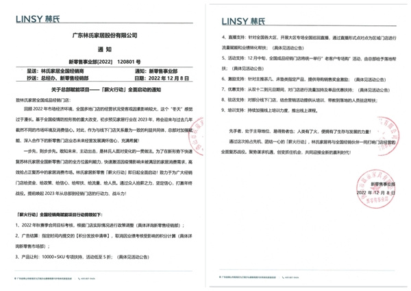 “薪火行動”通知顯示,為了在新形勢下快速復蘇林氏家居全國新零售門店的全方位盈利能力,快速激活因疫情影響未被滿足的家居消費需求,高效搶占正在復蘇中的家居消費市場,林氏家居新零售“薪火行動”于2022年12月8日全面啟動。“薪火行動”是為了給終端注入強心針,輔助終端門店在線下市場中打開銷路、增強信心,助力全國合作伙伴業績騰飛,同時也為來年業績突破蓄勢。點火只是第一步,點亮全國才是目標。
