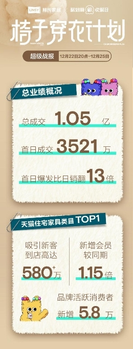 從林氏家居公布的戰報獲悉,自12月22日20點活動之始到12月25日,林氏家居總成交額達1.05億,首日成交額達3521萬,首日爆發比日銷售額翻13倍,吸引新客到店高達580+萬,新增會員教同期增長1.15倍,品牌活躍消費者新增5.8萬。