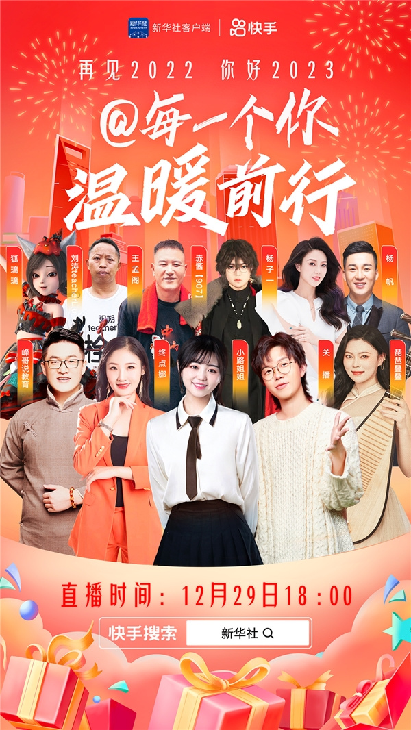 12月29日,在快手百大主播狂歡盛典舉行前夕,新華社直播IP“@每一個你”推出“溫暖前行”年終專場,連麥快手2022百大主播終點娜、王孟閣、楊子一、楊帆、狐璃璃、琵琶疊疊、赤醬、峰哥說教育,將目光聚焦到從滿地煙火中突圍的平凡人,回顧他們如何通過直播閃耀出獨特光芒,支撐起快手老鐵對美好生活的向往。