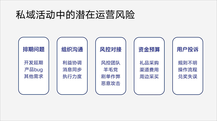 大型增長項目潛在風險和問題要比想象中要多的多。除了活動本身的潛在風險,還有很多其他環節的問題,其中跟活動直接相關的涉及排期問題、組織溝通、風控對接、資金預算、用戶投訴。