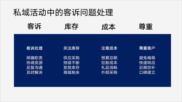 第四個尊重客戶,處理客訴問題最重要的是及時解決用戶的問題,同時要做到對用戶的尊重。這也是屬于用戶管理的一部分,用戶對我們的活動有意見,說明這個用戶對我們還是有一些期待的,很多用戶如果對平臺不感興趣根本就不會來投訴,可能就直接卸載掉了APP。對于一些有意見的用戶要多搜集和匯總一下,及時響應。對于優化產品鏈路,提升用戶的口碑都是一些細節的打磨工作。