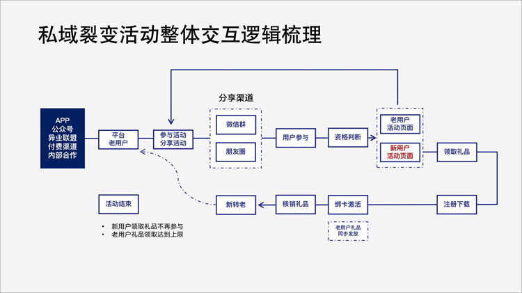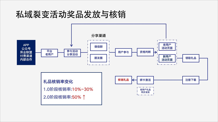 如果新用戶需要使用領取的優惠券就需要完成綁卡等身份驗證動作,當新用戶完成綁卡這樣的動作之后,老用戶也會同步收到對應的禮品誘餌。新老用戶都可以去完成禮品的線上核銷動作。這時候新用戶已經完成了身份的轉換,從新用戶變成了老用戶,也可以繼續參與平臺活動進行活動的分享和傳播。