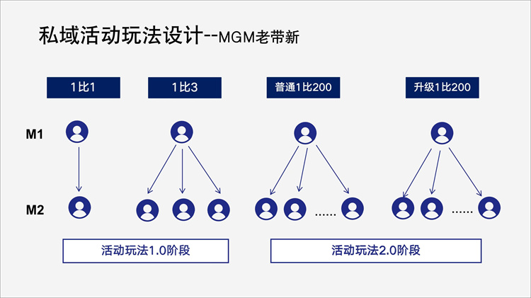 在1.0和2.0這2個階段的測試過程中間,不斷的嘗試最終形成了這四種玩法的探索,底層的邏輯都是基于老帶新模式的思考和完善。