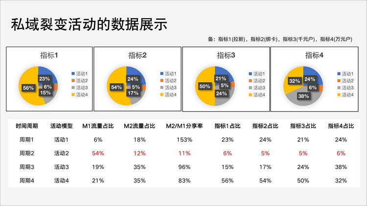 先來對項目中的一些概念做下解釋,這里的M1指的是老用戶頁面,M2指的是新用戶頁面,M1流量指的是老用戶頁面流量,M2流量指的是新用戶頁面流量。活動1、2、3、4分別對應的是前面講的1比1版本活動,1比3版本活動,1比200普通版本活動,1比200升級版本活動。指標1是拉新,指標2是綁卡,指標3是千元戶,指標4是萬元戶。拉新、綁卡、千元戶到萬元戶是對拉新增長難度的逐步升級,也是為了推進真實業務增長。在增長的不同階段,拉新難度不斷的提升。