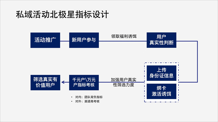 在這一步其實已經可以篩選很多非真實用戶了。把一些低質量的用戶擋在活動外。后期為了增強對外部供應商的考核以及加強活動增長的質量,還增加了理財入金的考核,也就是千元戶和萬元戶指標。這里稍微做下解釋,千元戶,萬元戶可以簡單的理解為用戶下載我們的APP之后,一定時間內完成的存款額度考核。