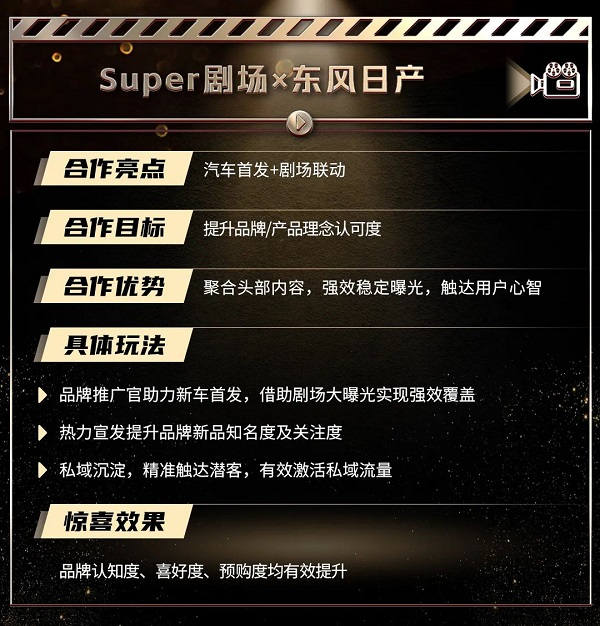 東風日產通過與Super劇場合作,為品牌新品上市實現全面精準強效的營銷推廣。通過品牌推廣定制廣告及頭部大劇熱力推廣,助力品牌新品發布的強認知、強覆蓋。