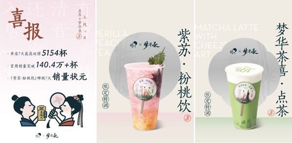 《夢華錄》中的“茶”文化與喜茶的產品定位完美契合,這是品牌營銷成功的基礎。在此基礎上,品牌在植入時不用刻意去演繹就直接與劇集場景相融合,輕松輸出產品賣點;而在劇外,喜茶根據《夢華錄》的人物和劇集元素,推出聯名產品、開設線下主題店,覆蓋人群從觀眾拓展到泛大眾,擴大品牌認知,同時,這些聯名品又是新的社交話題,自來水主動參與引發二次傳播,品牌的聲量與銷量也進一步提升。